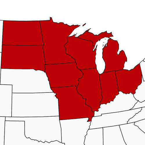 Illinois, Indiana, Iowa, Michigan, Minnesota, Missouri, North Dakota, Ohio, South Dakota, Wisconsin