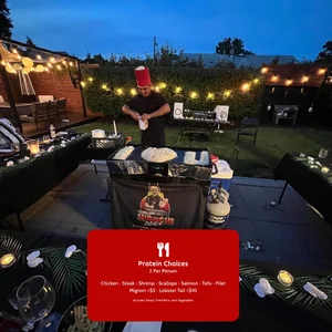All you need to do is set up tables and chairs, and provide plates and utensils for your party. Each person gets a side salad, hibachi vegetables, fried rice and 2 proteins of their choice.