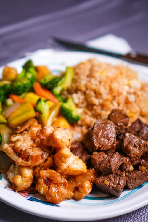 Choice of 2 proteins, fried rice, vegetables, and a side salad.